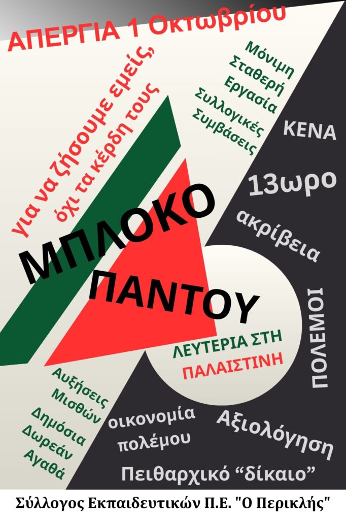 Την 1η Οκτωβρίου κλείνουμε όλα τα σχολεία. Κατεβαίνουμε όλοι και όλες στον δρόμο, για εμάς, για τις οικογένειές μας, για τους μαθητές μας. Υπερασπιζόμαστε τη ζωή και την αξιοπρέπειά μας! Στέλνουμε καθαρό μήνυμα: η πολιτική που μας γυρίζει στον μεσαίωνα, που μας καταδικάζει σε φτώχεια και εξάντληση, το νομοσχέδιο της κυβέρνησης για το 13ώρο, να πεταχτεί στα σκουπίδια.