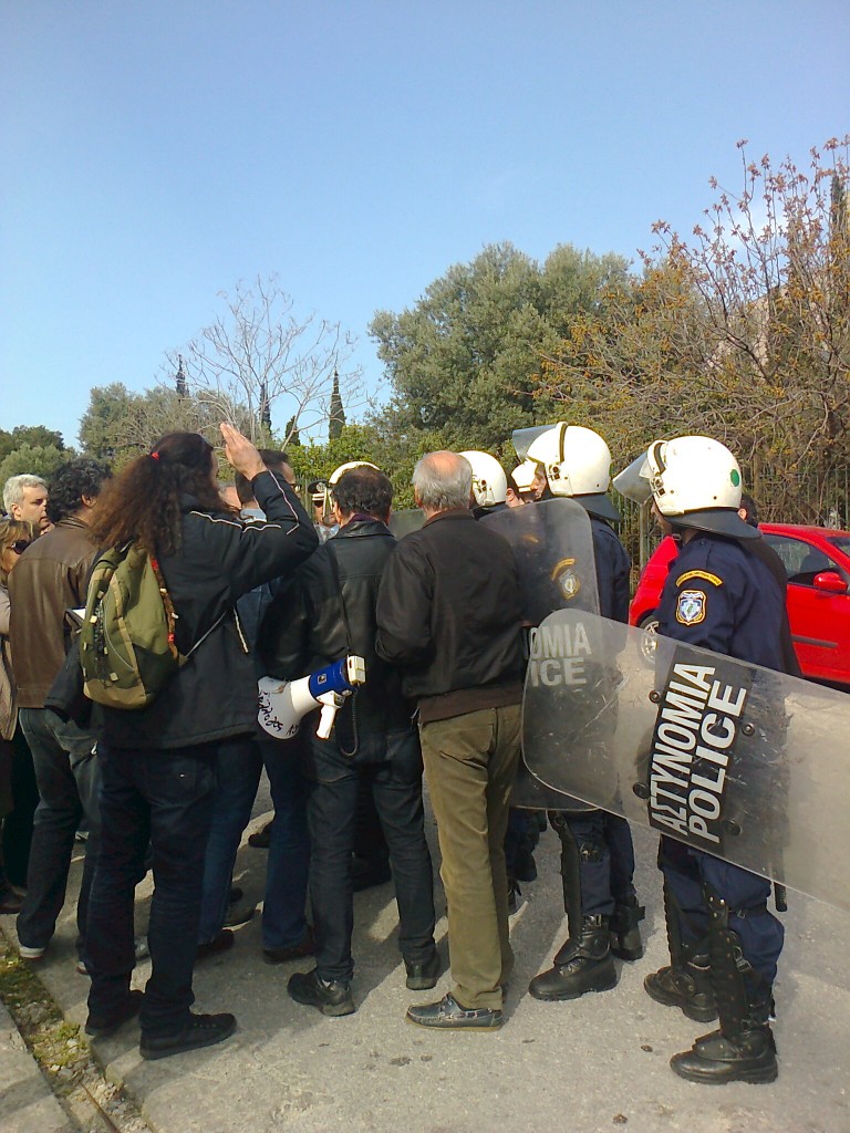 Η διαδήλωση πυκνώνει, κάθε λίγο υπάρχει ένταση με τα ΜΑΤ. Τα ΜΑΤ με μια οργανωμένη επίθεση, με σπρωξιές, χτυπήματα, χημικά, απωθούν μπροστά από την πύλη το μπλοκ των εκπαιδευτικών. Μεμονωμένα επιχειρούν μέσα από το πλήθος των συγκεντρωμένων να περάσουν στο υπουργείο διευθυντές εκπαίδευσης αλλά γίνονται αντιληπτοί, αποδοκιμάζονται και υποχρεώνονται να υποχωρήσουν.