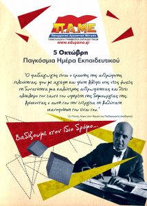 Με αφορμή την 5 Οκτώβρη, παγκόσμια μέρα εκπαιδευτικού, απευθυνόμαστε, με τα λόγια του μεγάλου παιδαγωγού Δημήτρη Γληνού, σε όλους αυτούς που έχουν έγνοια για τους μαθητές τους και το μέλλον τους: