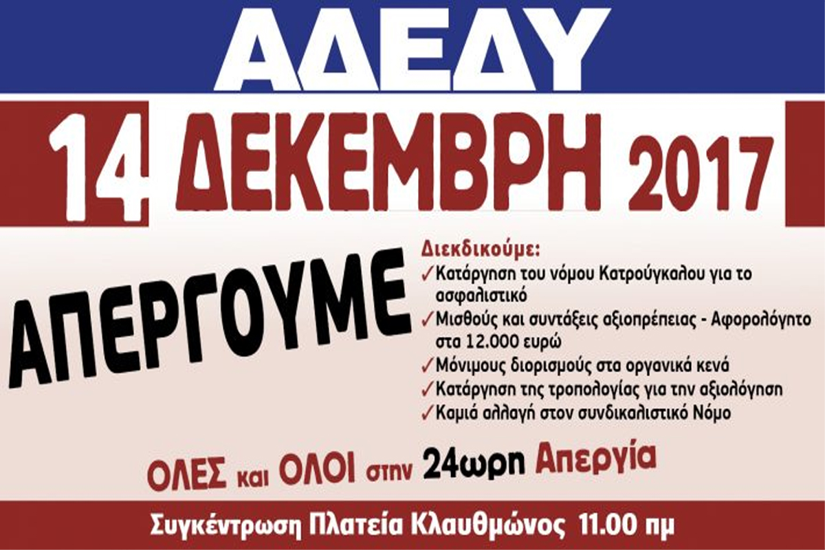 ΑΔΕΔΥ: 14 Δεκέμβρη 2017 -ΑΠΕΡΓΟΥΜΕ.