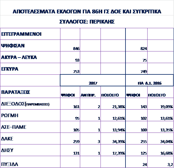 Η ΔΙΕΞΟΔΟΣ Η ΑΓΩΝΙΣΤΙΚΗ ΣΥΣΠΕΙΡΩΣΗ του Συλλόγου μας « Ο Περικλής» ευχαριστεί όλους τους συναδέλφους που μας στήριξαν στις εκλογές για την ανάδειξη αντιπροσώπων στην 86η Γενική Συνέλευση της Δ.Ο.Ε.