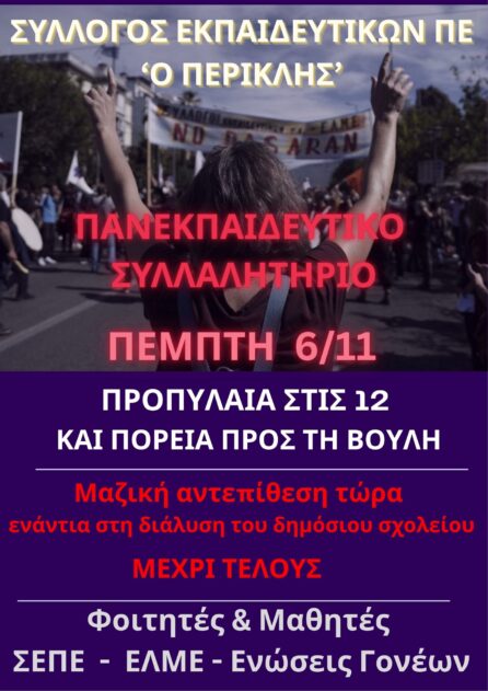 Πανεκπαιδευτικό συλλαλητήριο , Πέμπτη 6/11, 12:00 στα Προπύλαια 1 – 4 ώρες διευκολυντική στάση εργασία