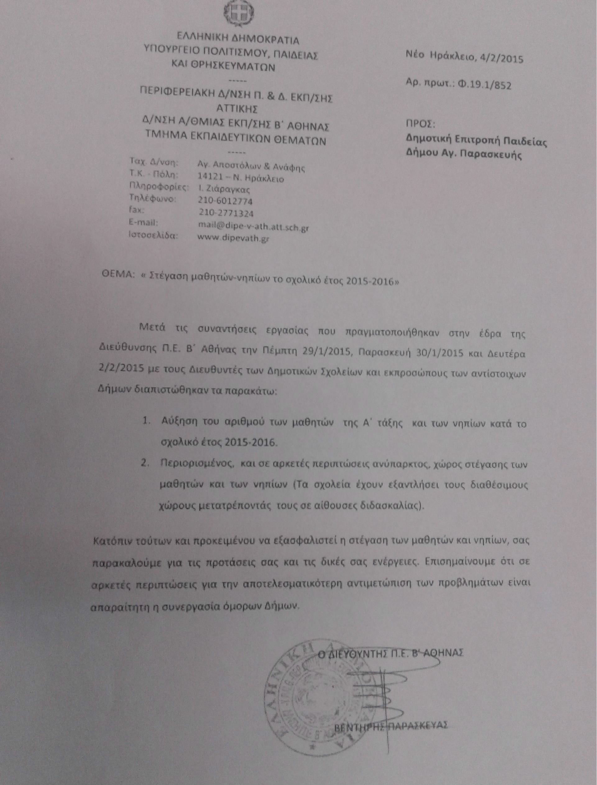 Μετά την καταχρηστική και κατά κόρον εφαρμογή της εγκυκλίου για  αύξηση του αριθμού των νηπίων και των μαθητών ανά τμήμα, μετά την υποχρεωτική μετακίνηση νηπίων και μαθητών από το σχολείο της περιοχής τους σε όμορες σχολικές μονάδες, δίνοντας σάρκα και οστά στην κατάργηση του σχολείου της γειτονιάς,  ο  Διευθυντής  Εκπαίδευσης Β΄Αθήνας  εκτιμά σε επίσημο έγγραφο του προς τη ΔΕΠ Αγίας Παρασκευής ότι σε αρκετές περιπτώσεις για την αποτελεσματικότερη αντιμετώπιση των προβλημάτων (στέγασης των μαθητών) είναι απαραίτητη  η συνεργασία όμορων δήμων.