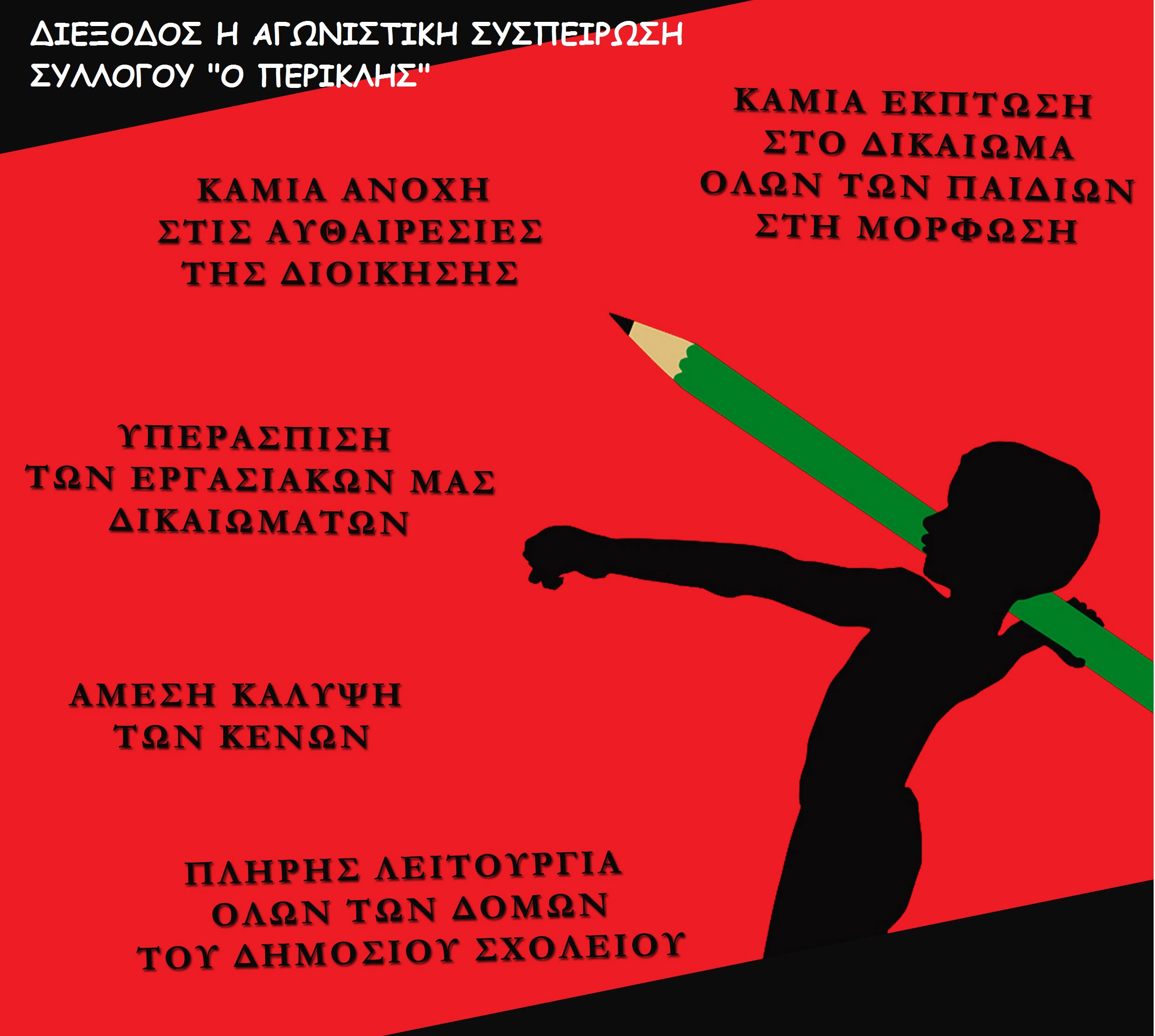 Οι προϋποθέσεις για να νικήσουν τα μορφωτικά και εργασιακά δικαιώματα, χτίζονται με μαχητικούς αγώνες και με τον συντονισμό όσων αγωνίζονται και των σωματείων τους. Αυτόν τον δρόμο της ρήξης και της ανατροπής οφείλουμε να προσπαθούμε κι όχι να ανεχτούμε τον βέβαιο «θάνατο» των δικαιωμάτων μας.