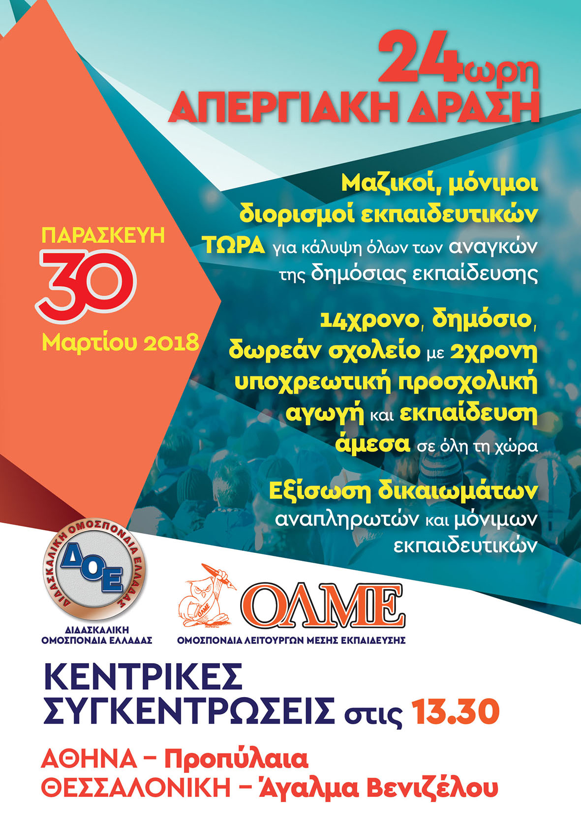 ΔΟΕ: ΜΟΝΙΜΟΙ ΜΑΖΙΚΟΙ ΔΙΟΡΙΣΜΟΙ ΤΩΡΑ!!! Κινητοποίηση 29 & 30/3/2018. Αίτημα συνάντησης με τον Πρωθυπουργό.