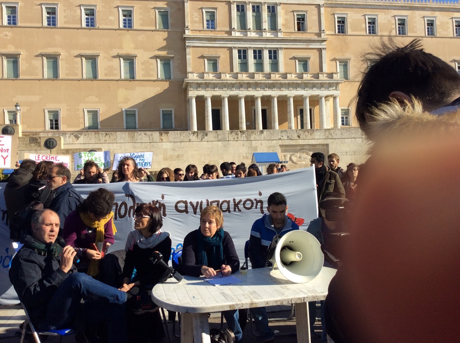 Δυναμική η συγκέντρωση στα γραφεία της ΕΕ, η πορεία στη βουλή και η συνέντευξη τύπου που οργάνωσαν αντιρατσιστικές οργανώσεις, κινήματα αλληλεγγύης, κοινωνικές και πολιτικές συλλογικότητες μαζί με τους Βάσκους αγωνιστές που είχαν συλληφθεί στην Ηγουμενίτσα και αντιμετωπίζουν βαριές κατηγορίες για την επιχείρηση μεταφοράς 8 προσφύγων από την Ελλάδα στη χώρα των Βάσκων. Με μαζική παρουσία αγωνιστών από τις συλλογικότητες που οργάνωναν την κινητοποίηση, με συνθήματα ενάντια στην ποινικοποίηση της αλληλεγγύης, ενάντια στην επαίσχυντη συμφωνία ΕΕ- Τουρκίας και στην πολιτική των κλειστών συνόρων και των στρατοπέδων συγκέντρωσης, ενάντια στον πόλεμο και το ρατσισμό, τη φτώχεια και το φασισμό, η πορεία κατέληξε στο Σύνταγμα όπου δόθηκε συνέντευξη τύπου έξω από τη βουλή, μπροστά από τον άγνωστο στρατιώτη.