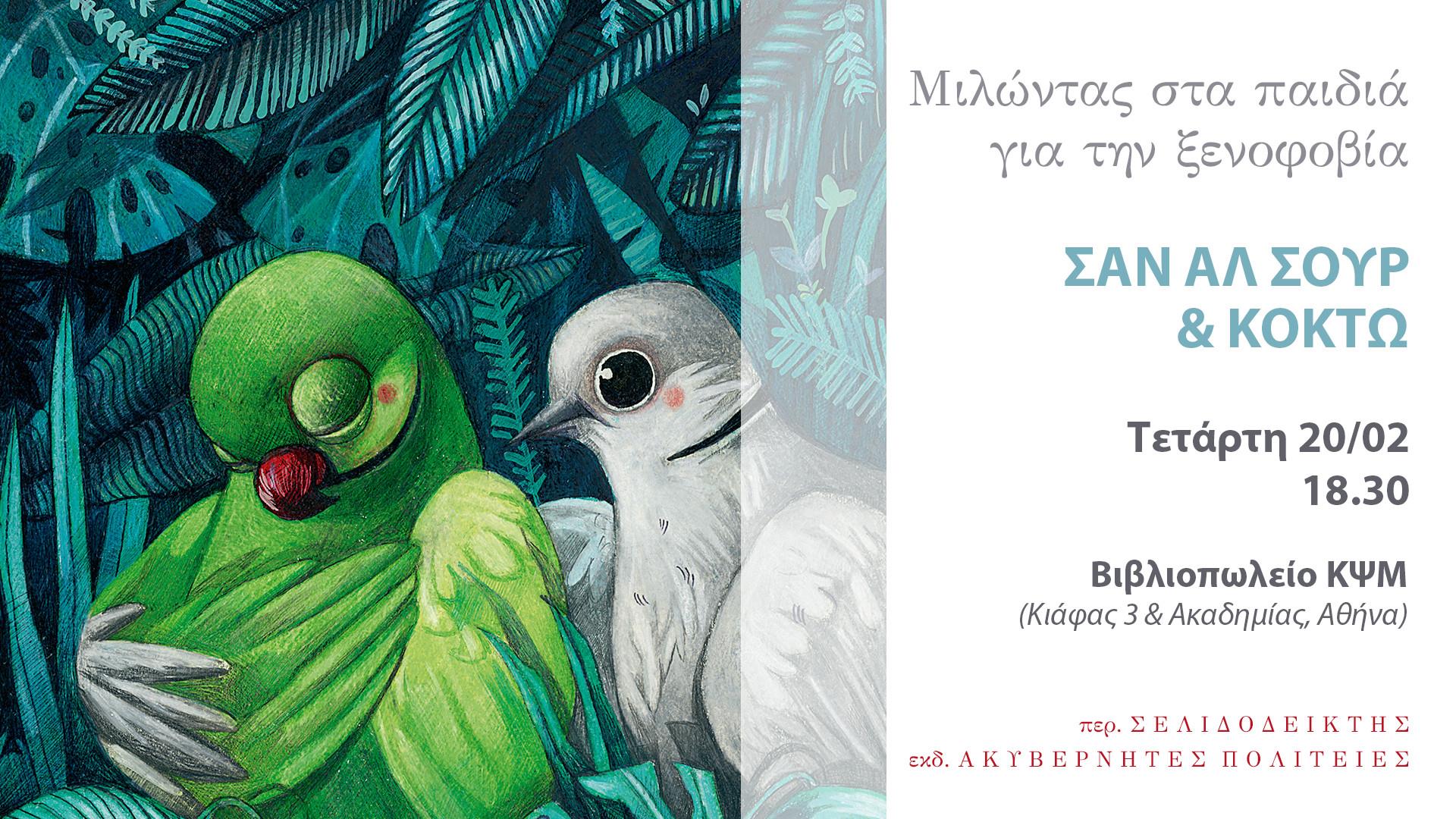 Οι εκδόσεις Ακυβέρνητες Πολιτείες και το περιοδικό Σελιδοδείκτης διοργανώνουν εκδήλωση με θέμα «Μιλώντας στα παιδιά για την ξενοφοβία» με αφορμή το παιδικό βιβλίο «Σαν Αλ Σουρ και Κοκτώ» της Χρύσας Καραμήτρου σε εικονογράφηση της Κατερίνας Χαδουλού.