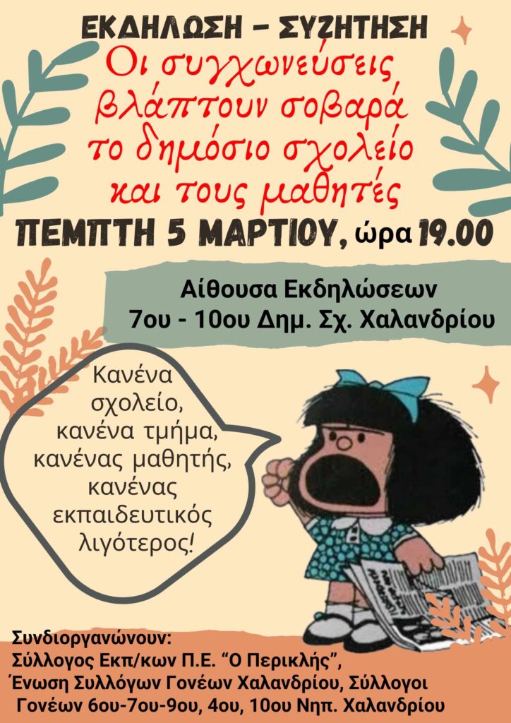 Ο Σύλλογος Εκπαιδευτικών Π.Ε. ” Ο Περικλής” καλεί  τους συναδέλφους και συναδέλφισσες, τους γονείς των μαθητών μας  και όλη την τοπική κοινωνία στην ανοιχτή εκδήλωση – συζήτηση που διοργανώνει από κοινού με την Ένωση Συλλόγων Γονέων και τους Συλλόγους Γονέων των 6ου-7ου-9ου ,4ου και 10ου Νηπιαγωγείων Χαλανδρίου την Πέμπτη 5 Μαρτίου 2026 ώρα 7μ.μ. στο 7ο-10ο Δημοτικό Σχολείο Χαλανδρίου με θέμα : ” Οι συγχωνεύσεις βλάπτουν σοβαρά το δημόσιο σχολείο και τους μαθητές”
