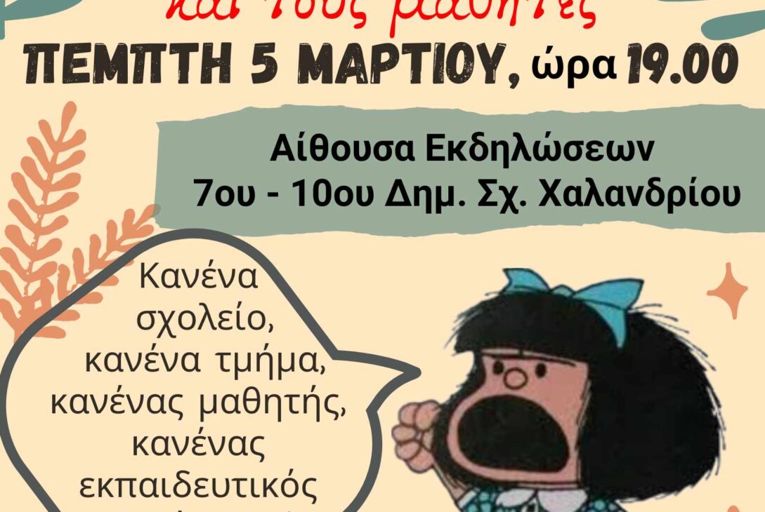 Ο Σύλλογος Εκπαιδευτικών Π.Ε. ” Ο Περικλής” καλεί  τους συναδέλφους και συναδέλφισσες, τους γονείς των μαθητών μας  και όλη την τοπική κοινωνία στην ανοιχτή εκδήλωση – συζήτηση που διοργανώνει από κοινού με την Ένωση Συλλόγων Γονέων και τους Συλλόγους Γονέων των 6ου-7ου-9ου ,4ου και 10ου Νηπιαγωγείων Χαλανδρίου την Πέμπτη 5 Μαρτίου 2026 ώρα 7μ.μ. στο 7ο-10ο Δημοτικό Σχολείο Χαλανδρίου με θέμα : ” Οι συγχωνεύσεις βλάπτουν σοβαρά το δημόσιο σχολείο και τους μαθητές”