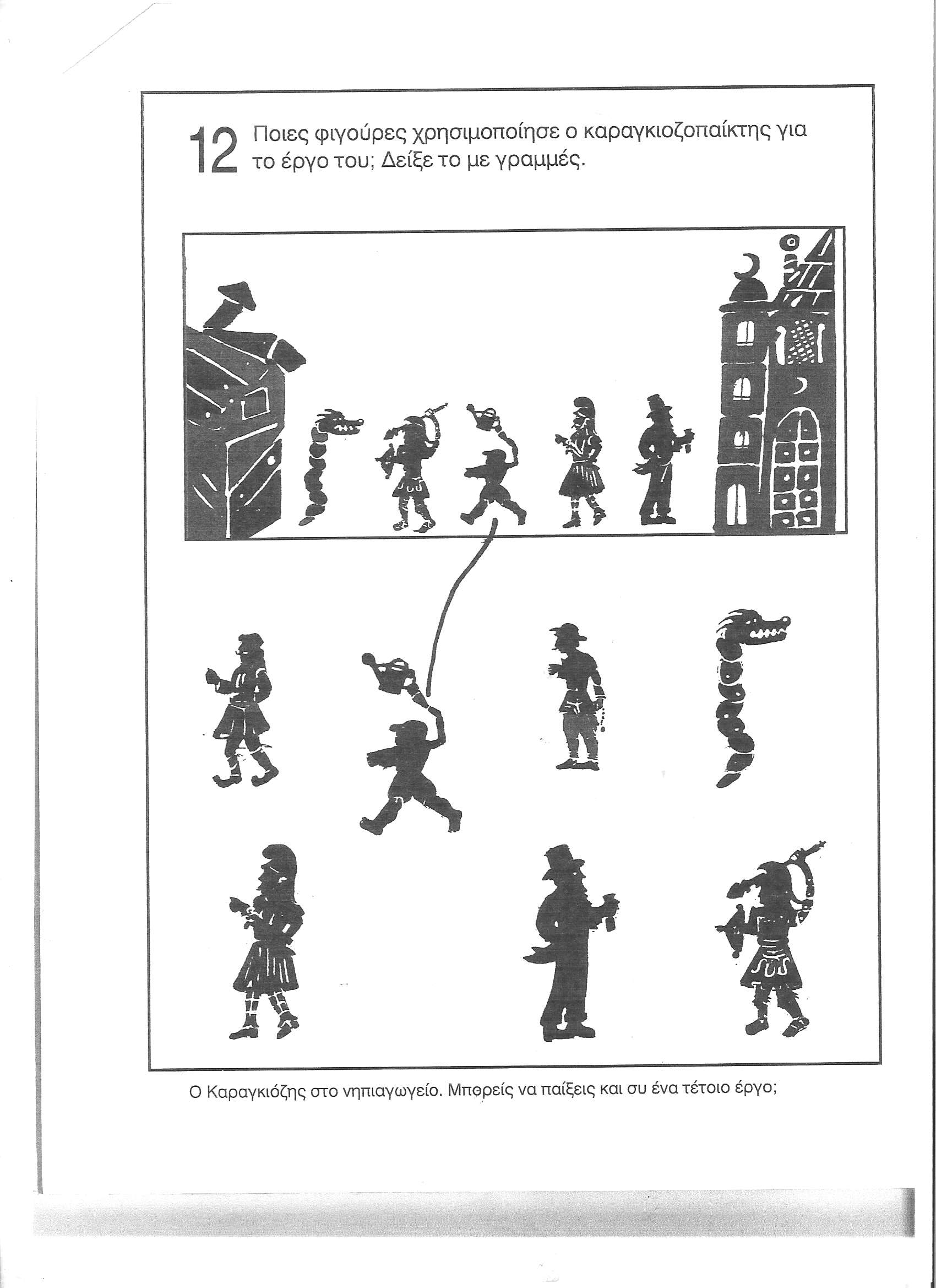 - Γνωρίζουμε τον Καραγκιόζη και την παρέα του μέσα από τις φιγούρες του ελληνικού θεάτρου σκιών. Παρατηρούμε και περιγράφουμε.
