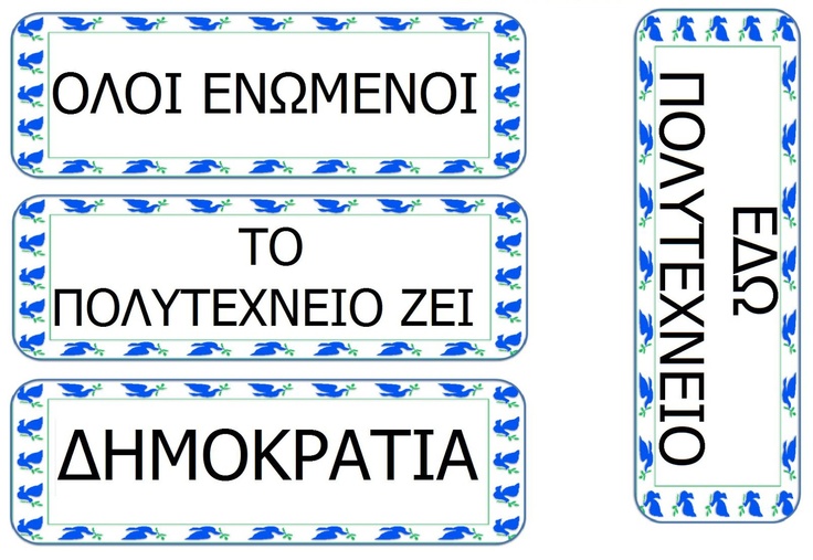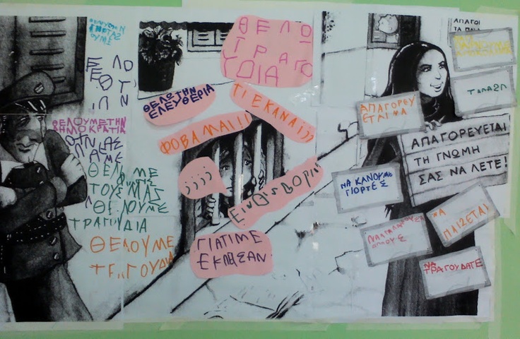 - Ομαδικό κολλάζ : τα κάγκελα, η πύλη, οι φοιτητές, η σημαία, το πανό