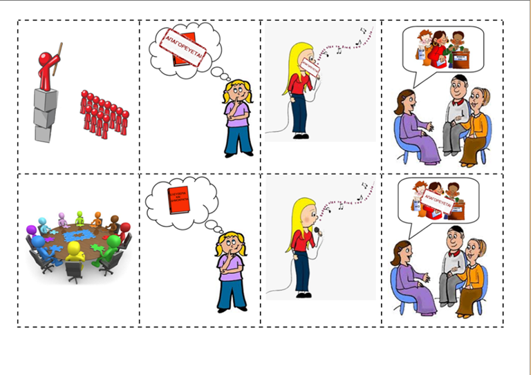 - Παιχνίδι παντομίμας: Αναπαριστούμε με το δικό μας τρόπο και με το σώμα μας τις ιδέες της κίνησης/ ακινησίας, ανεξαρτησίας/ υποταγής, ομοιομορφίας/ διαφορετικότητας, παθητικότητας / δράσης