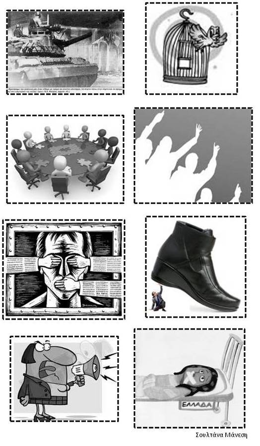 - Παρατήρηση των εικόνων, συζήτηση με αναφορά στις κοινωνικές και πολιτικές συνθήκες που επικρατούν στα δύο διαφορετικά καθεστώτα.