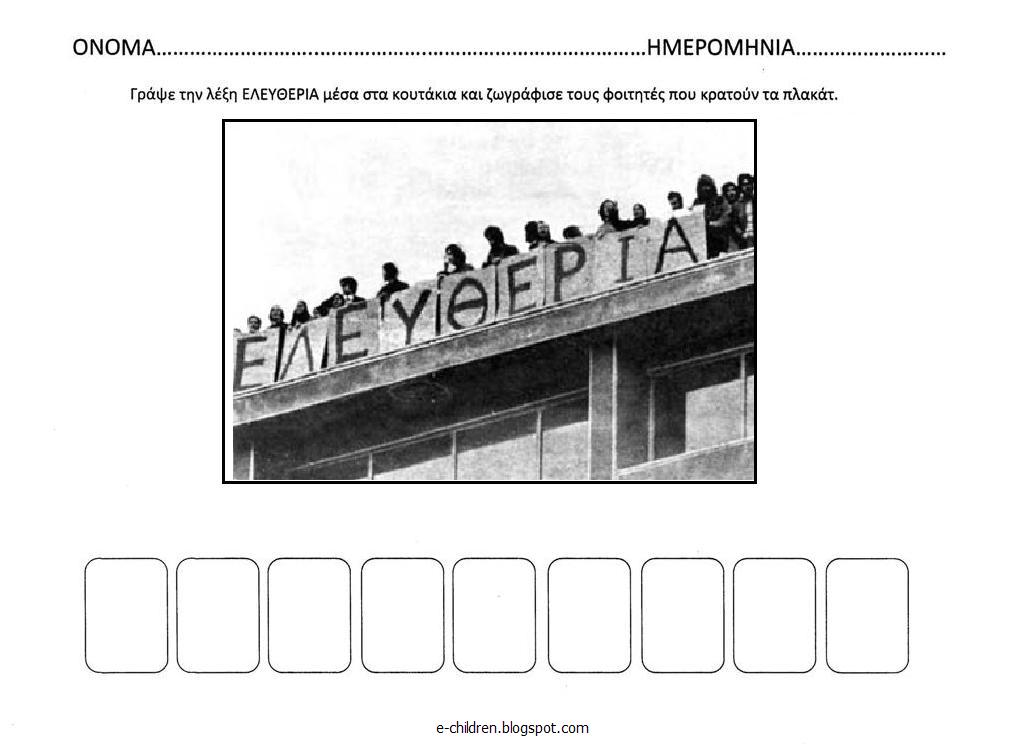 H επέτειος της εξέγερσης του Πολυτεχνείου αποτελεί ένα από τα σημαντικότερα ιστορικά γεγονότα της σύγχρονης Ελλάδας .Η προσέγγιση του θέματος στο Νηπιαγωγείο μπορεί να γίνει μέσα από ένα πλήθος εκπαιδευτικών δραστηριοτήτων ώστε να γίνει κατανοητή από τα νήπια και να αναδειχθεί τόσο η ιστορική του σημασία όσο και η διασύνδεσή του με την παρούσα πολιτική και κοινωνική πραγματικότητα.