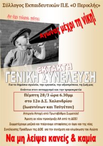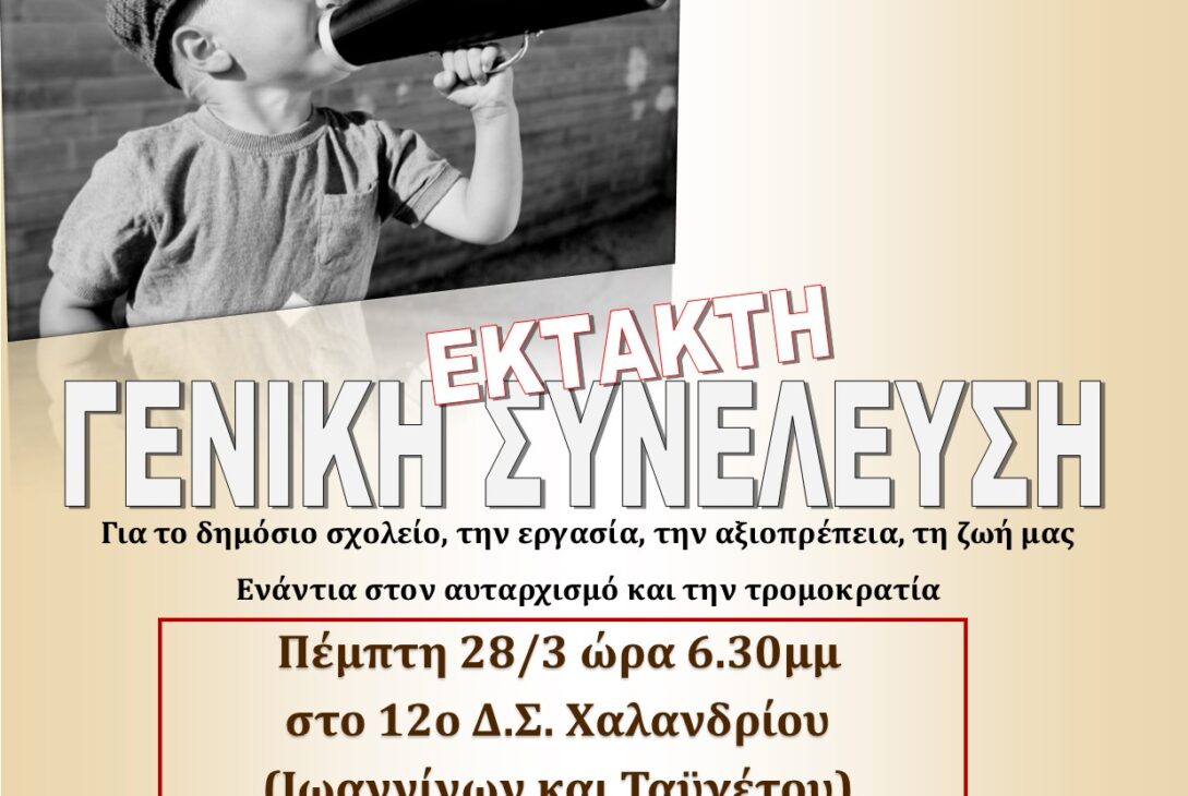 Όλες/οι στην έκτακτη Γενική Συνέλευση του Συλλόγου μας την Πέμπτη 28 Μαρτίου ώρα 6.30μμ στο 12ο ΔΣ Χαλανδρίου