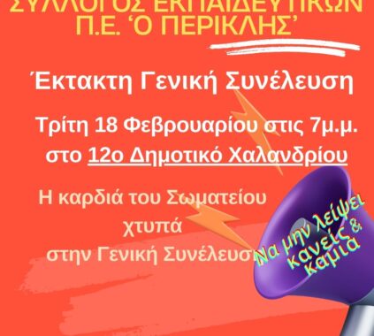 Έκτακτη Γενική Συνέλευση 29 Οκτωβρίου στις 7μμ στο 12ο ΔΣ Χαλανδρίου