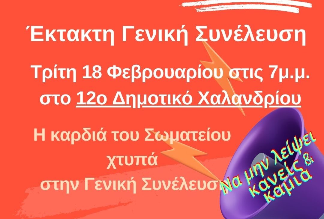 Ο Σύλλογός μας καλεί τους συναδέλφους και τις συναδέλφισσες σε έκτακτη Γενική Συνέλευση στην οποία καλούμε να υπάρξει μαζική συμμετοχή και απαρτία προκειμένου να πάρουμε αποφάσεις εν όψει της ολομέλειας των προέδρων της ΔΟΕ την 23η Φεβρουαρίου, όπου και πρέπει να απαιτήσουμε η ομοσπονδία να πάρει όλα τα αναγκαία μέτρα για την συνέχιση και κλιμάκωση του αγώνα.