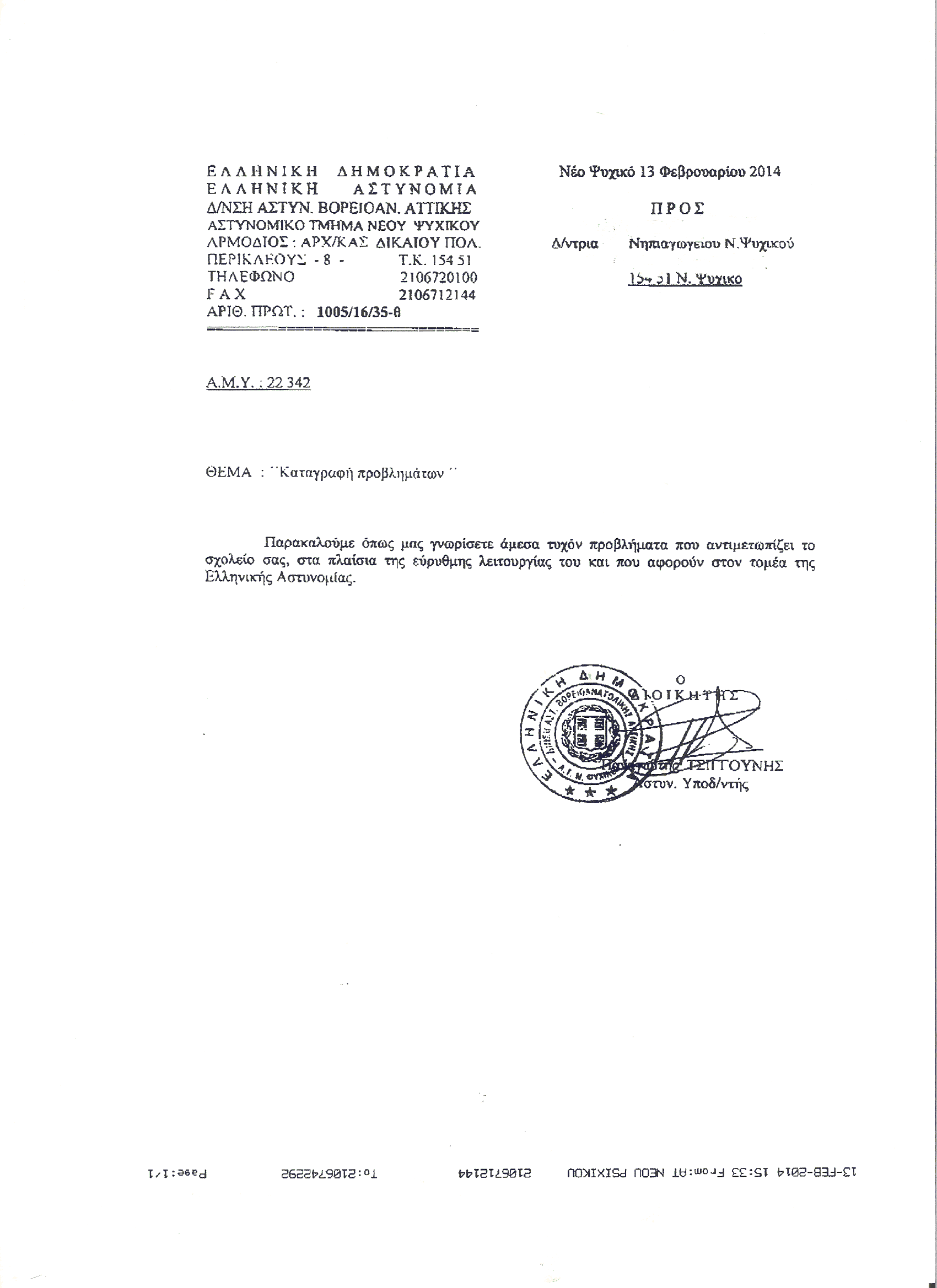 Για του λόγου το αληθές παραθέτουμε το έγγραφο – κλήση προς την Προϊσταμένη Νηπιαγωγείου του Ν.Ψυχικού από τον Διοικητή του οικείου αστυνομικού τμήματος με το οποίο παρακαλείται να γνωστοποιήσει « άμεσα τυχόν προβλήματα που αντιμετωπίζει το σχολείο » της, « στα πλαίσια της εύρυθμης λειτουργίας του και που αφορούν στον τομέα της Ελληνικής Αστυνομίας » και τα οποία καταφανώς υπάγονται στην κατηγορία των προαναφερθέντων.