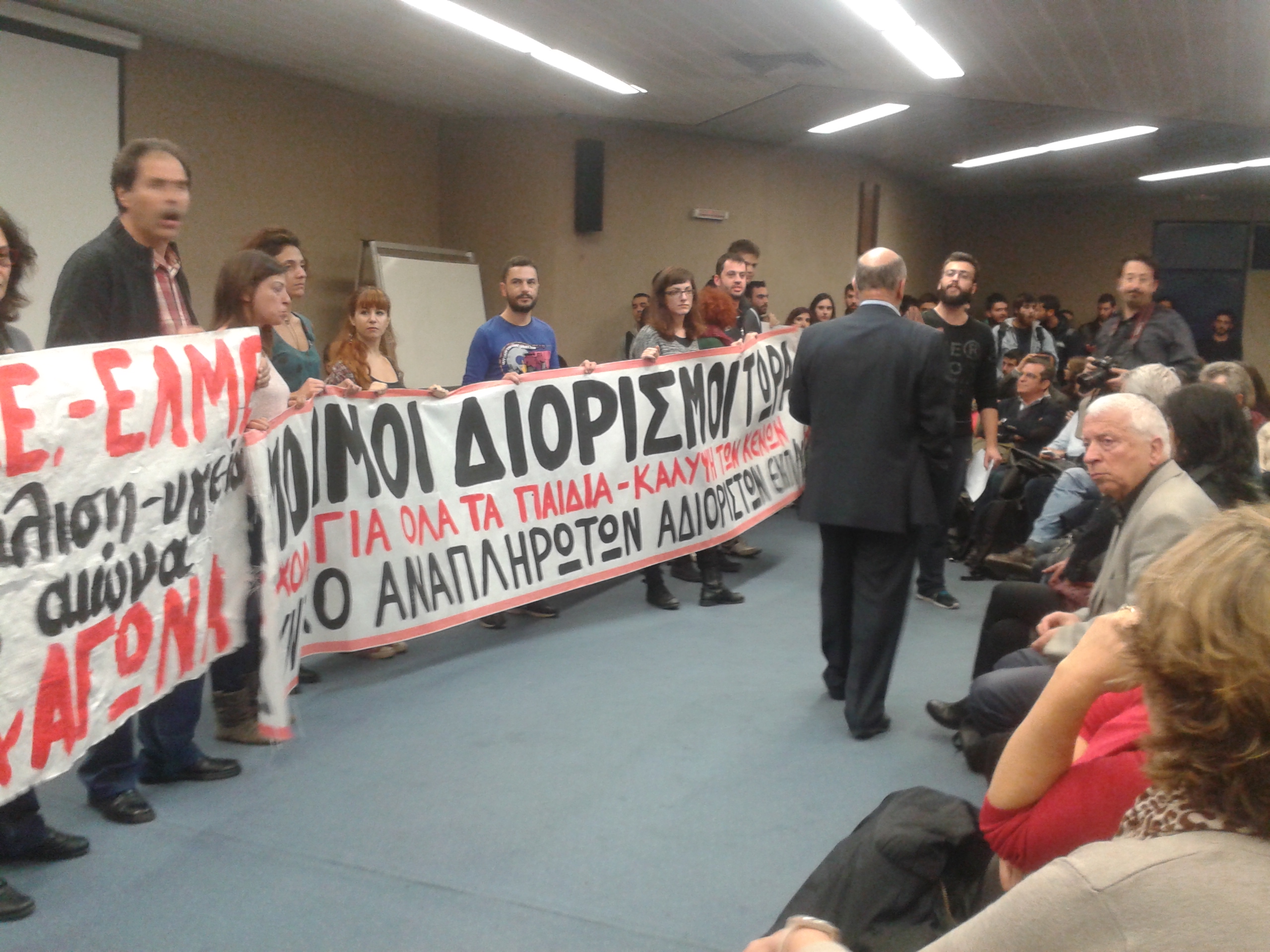 «Θέλουμε δουλειά, θέλουμε ζωή» φωνάζαν δεκάδες εκπαιδευτικοί και φοιτητές οι οποίοι είχαν συγκεντρωθεί μέσα και έξω από το αμφιθέατρο.