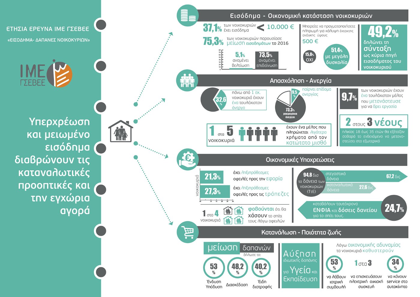 2. Το 75,3% των νοικοκυριών παρουσίασε μείωση των εισοδημάτων το 2016 σε σχέση με το 2015, με σαφέστατη την τάση διεύρυνσης της ανισότητας υπέρ των ανώτερων εισοδηματικών κλιμακίων (στην κατηγορία άνω των 30,000€ παρουσιάζεται αύξηση στο 11,1% του πληθυσμού). Ιδιαίτερα ευάλωτα είναι τα μονομελή νοικοκυριά και όσα έχουν ένα άνεργο στο νοικοκυριό. Ενδεικτικό είναι το γεγονός ότι μόνο το 1,5% του πληθυσμού καταφέρνει να αποταμιεύσει. Σύμφωνα με στοιχεία της AMECO, η καθαρή αποταμίευση του ιδιωτικού τομέα το 2015 μειώθηκε κατά 9,5 δις. Σε πρόσφατη μελέτη της Ευρωπαϊκής Κεντρικής Τράπεζας, επισημαίνεται ότι τα ελληνικά νοικοκυριά έχουν απολέσει το 35,9% της αξίας των περιουσιακών τους στοιχείων μετά την έναρξη της κρίσης.