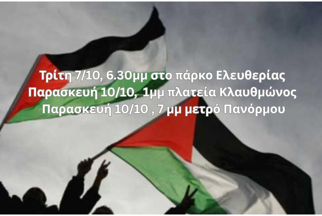 - Την Τρίτη στις 7/10, 6.30μμ στο πάρκο Ελευθερίας και πορεία στην Αμερικανική και Ισραηλινή πρεσβεία και στις διαδηλώσεις που θα οργανωθούν σε όλη τη χώρα.