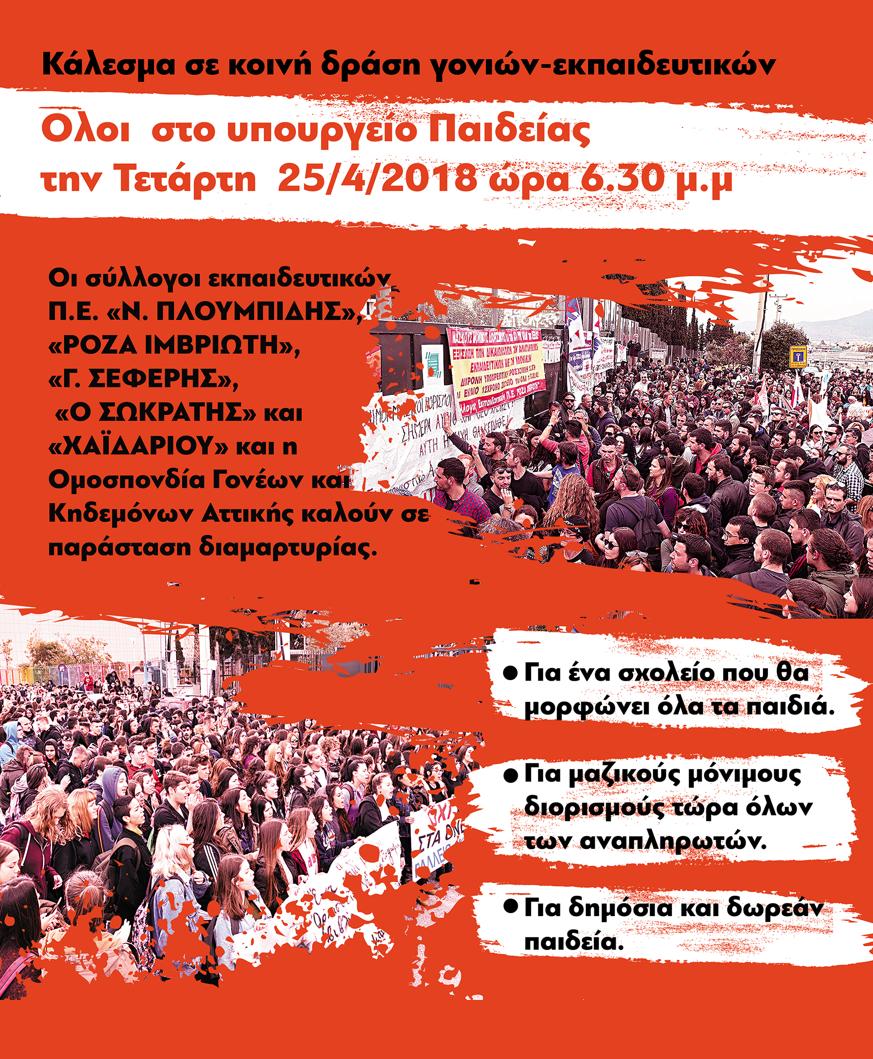Όλοι στην παράσταση διαμαρτυρίας στο Υπουργείο Παιδείας την Τετάρτη 25 Απριλίου στις 6:30 μ.μ. και συνάντηση με την πολιτική ηγεσία του Υπουργείου που συνδιοργανώνεται από Σωματεία Εκπαιδευτικών , Ενώσεις Γονέων και Συλλόγους Γονέων διεκδικώντας :