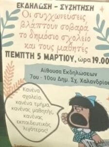 Με μεγάλη συμμετοχή γονέων, εκπαιδευτικών και ενεργών πολιτών πραγματοποιήθηκε στις 5/3/2026 η εκδήλωση με θέμα «Οι συγχωνεύσεις βλάπτουν σοβαρά το δημόσιο σχολείο και τους μαθητές», που συνδιοργανώθηκε από τον Σύλλογο Εκπαιδευτικών Π.Ε. «Ο Περικλής», την Ένωση Συλλόγων Γονέων Μαθητών Χαλανδρίου και τους Συλλόγους Γονέων 4ου και 10ου Νηπιαγωγείου Χαλανδρίου, καθώς και 6ου, 7ου και 9ου Νηπιαγωγείου Χαλανδρίου, για τα οποία έχουν δρομολογηθεί συγχωνεύσεις από την επόμενη σχολική χρονιά.
