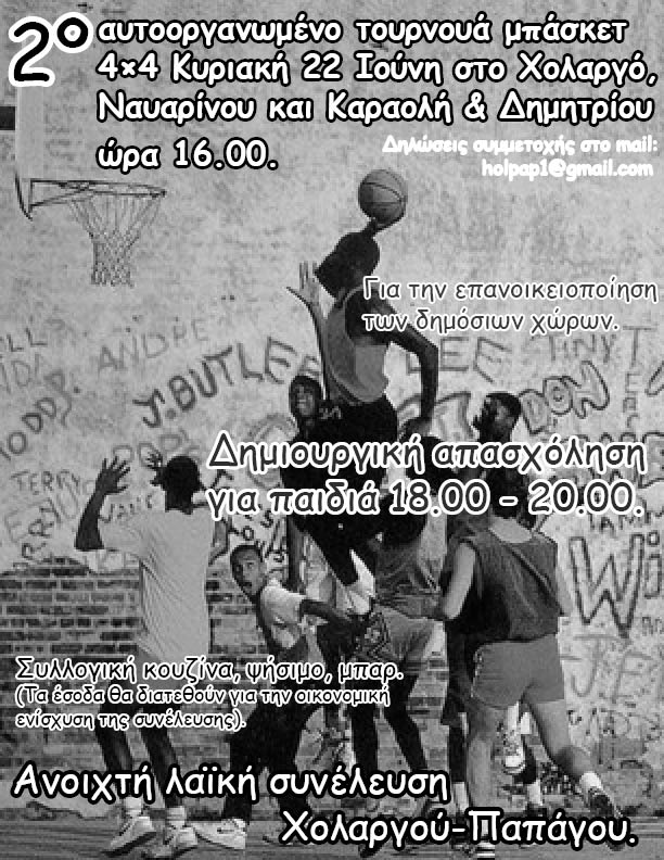 Αυτή την Κυριακή 22/6, θα πραγματοποιηθεί το 2ο τουρνουά μπάσκετ 4*4, που διοργανώνει η Ανοιχτή Λαϊκή Συνέλευση Χολαργού-Παπάγου.
