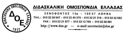 ΣυναδÝλφισσες, ΣυνÜδελφοι, Στο ξεκßνημα της δυσκολüτερης σχολικÞς χρονιÜς, στην ιστορßα της σýγχρονης ΕλλÜδας, το Δ.Σ. της Ομοσπονδßας αποφÜσισε να απευθýνει ανοιχτÞ επιστολÞ προς τους γονεßς των μαθητþν της ΠρωτοβÜθμιας Εκπαßδευσης προκειμÝνου να τους ενημερþσει για τα συσσωρευμÝνα προβλÞματα που αντιμετωπßζει το Δημüσιο Σχολεßο και οι Εκπαιδευτικοß. ΣυναδÝλφισσες, ΣυνÜδελφοι, Χωρßς να παραγνωρßζουμε τις δυσκολßες αναπαραγωγÞς της, παρακαλοýμε να κÜνετε κÜθε δυνατÞ προσπÜθεια προκειμÝνου η επιστολÞ αυτÞ να διανεμηθεß σε üλα τα σχολεßα την ημÝρα του αγιασμοý. ¼σα σχολεßα αντιμετωπßζουν δυσκολßες μποροýν να απευθυνθοýν στα μÝλη των Δ.Σ. των τοπικþν Συλλüγων. Την επιστολÞ μπορεßτε να την "κατεβÜσετε" απü την ιστοσελßδα της Ομοσπονδßας http://www.doe.gr/ Þ απü τον παρακÜτω σýνδεσμο http://www.doe.gr/11/epistoli2011.pdf