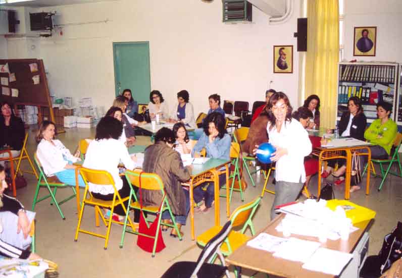 Εδώ διακρίνονται οι συνάδελφοι χωρισμένοι σε ομάδες να συμμετέχουν ενεργά στο βιωματικό εργαστήρι υπό την καθοδήγηση της κας Κουλοτυμπαρίτσης