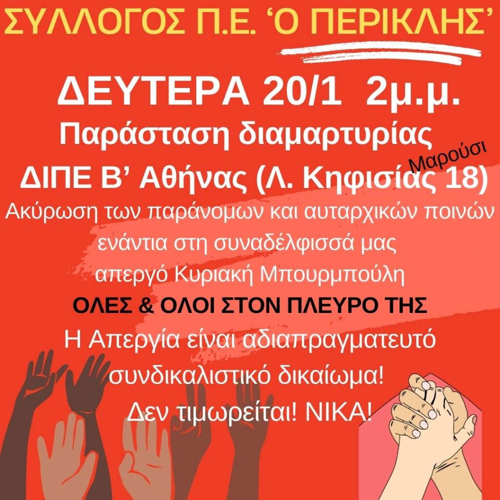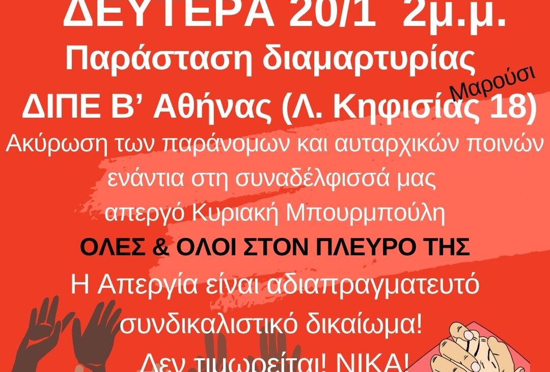 Στεκόμαστε αλληλέγγυοι όλες και όλοι στο πλευρό της Κυριακής. Συμμετέχουμε μαζικά και δυναμικά στην κινητοποίηση του σωματείου στην Διεύθυνση Π.Ε. Β’ Αθήνας την Δευτέρα 20/1 στις 2μ.μ. ενάντια στις παράνομες και αυταρχικές αποφάσεις σε βάρος της. Δεν είναι μόνη! Το σωματείο την στηρίζει και στην προσφυγή της στο Διοικητικό Εφετείο (22/1) για την ακύρωση των ποινών.