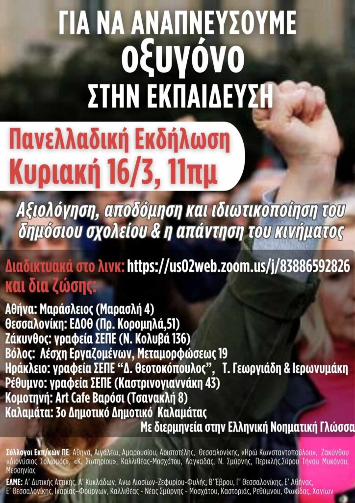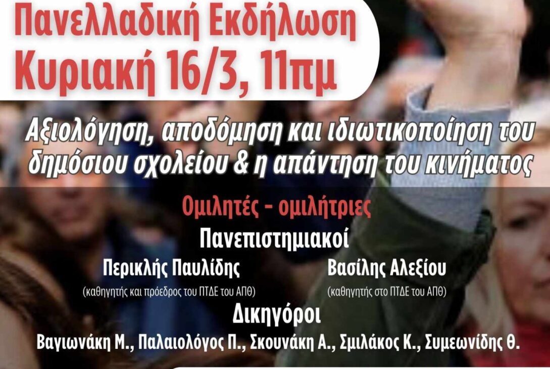 Οι Σύλλογοι ΠΕ και ΕΛΜΕ που συνυπογράφουμε τη διακήρυξη στήριξης απεργών και διωχθέντων σας καλούμε στην εκδήλωση –συζήτηση με θέμα: «Αξιολόγηση, αποδόμηση και ιδιωτικοποίηση του δημόσιου σχολείου και η απάντηση του κινήματος» την Κυριακή 16.3 στις 11:00πμ στην Μαράσλειο (Μαρασλή 4). Η εκδήλωση θα είναι δια ζώσης και με δυνατότητας διαδικτυακής σύνδεσης, με ομιλητές τους πανεπιστημιακούς Περικλή Παυλίδη (καθηγητής και πρόεδρος του ΠΤΔΕ του ΑΠΘ) και Βασίλη Αλεξίου (αναπληρωτής καθηγητής, ΠΤΔΕ του ΑΠΘ), τις/ τους δικηγόρους του κινήματος Βαγιωνάκη Μερόπη, Καλογερία Μαρία, Παλαιολόγο Παλαιολόγο, Παπαδάκη Κώστα, Σκουνάκη Αρετή, Σμιλάκο Κοσμά και Συμεωνίδη Θοδωρής και εκπροσώπους των σωματείων που θα συμμετέχουν.