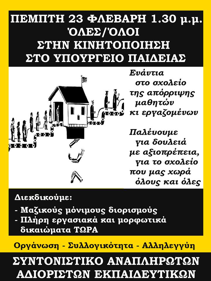 “Συμμετοχή στη συγκέντρωση αναπληρωτών, την Πέμπτη 23 Φεβρουαρίου 2017, 1 μ.μ.στο Υπουργείο Παιδείας. Για τη διευκόλυνση συμμετοχής των συναδέλφων, το Δ.Σ. του Συλλόγου μας κηρύσσει για την ημέρα εκείνη στάση εργασίας 12:00 – 16:00.”