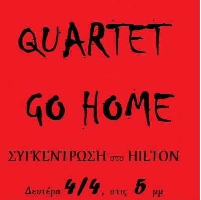 • Καλούμε τη Δευτέρα 4 Απρίλη στις 5 το απόγευμα σε μαζική συγκέντρωση στο Hilton. Εκεί, που καταλύουν οι θεσμοί και διαπραγματεύεται η κυβέρνηση την σφαγή μας, να βροντοφωνάξουμε: Είστε ανεπιθύμητοι! Δεν θα υπογράψετε την συμφωνία καταδίκη μας!