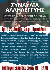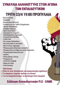 Η συναυλία αλληλεγγύης διοργανώνεται για τον αγώνα των εκπαιδευτικών για δημόσια δωρεάν παιδεία για όλους, ενάντια στην αξιολόγηση-κατηγοριοποίηση-εμπορευματοποίηση της παιδείας, στον αυταρχισμό και το χτύπημα του δικαιώματος στην απεργία την Τρίτη 23 Απρίλη, 7μ.μ., στα Προπύλαια