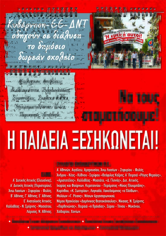 Κοινή διακήρυξη σωματείων και φορέων Κυβέρνηση – ΕΕ – ΔΝΤ οδηγούν σε διάλυση το δημόσιο δωρεάν σχολείο πανεκπαιδευτικό συλλαλητήριο ΣΑΒΒΑΤΟ 2 ΜΑΡΤΗ, 12 μμ, ΠΡΟΠΥΛΑΙΑ Τα σχολεία πεινάνε και κρυώνουν. Χιλιάδες παιδιά περνούν τις πόρτες τους πεινασμένα εξαιτίας της καπιταλιστικής κρίσης, της φτώχειας και της ανεργίας. Εκατοντάδες σχολεία δεν έχουν ούτε δεκάρα στα ταμεία τους. Διεκδικούμε συσσίτια για τα παιδιά, πετρέλαιο και αύξηση της κρατικής χρηματοδότησης για τα σχολεία μας. Τα σχολεία χρειάζονται δάσκαλους, νηπιαγωγούς και καθηγητές και όχι συγχωνεύσεις, συμπτύξεις, αύξηση αριθμού των μαθητών στα τμήματα. Αγωνιζόμαστε για μαζικούς διορισμούς μονίμων εκπαιδευτικών ώστε να καλυφθούν όλα τα κενά. Διεκδικούμε ίδρυση νέων νηπιαγωγείων ώστε να καλυφθούν όλες οι ανάγκες νηπίων/προνηπίων για φοίτηση. Τα σχολεία χρειάζονται δημοκρατία και όχι αξιολόγηση, απολύσεις, φόβο και υποταγή. Αγωνιζόμαστε για παιδαγωγική ελευθερία και δημοκρατική συλλογική λειτουργία του σχολείου, ενάντια στην αξιολόγηση – χειραγώγηση, για να μην περάσει το αυταρχικό Π.Δ. του Υπουργείου Παιδείας για την αξιολόγηση. Τα σχολεία χρειάζονται δωρεάν βιβλία και όχι σχέδια για άμεση ή σταδιακή κατάργηση της δωρεάν διανομής τους. Διεκδικούμε δωρεάν παιδεία για όλους. Ούτε δεκάρα από τις τσέπες των γονιών για βιβλία, πετρέλαιο, λειτουργικές δαπάνες, γραφική ύλη κλπ. Τα σχολεία είναι δημόσια ιδρύματα και όχι ιδιωτικές/κερδοσκοπικές επιχειρήσεις. Διαμορφώνουν το πρόγραμμά τους με βάση τις μορφωτικές ανάγκες των μαθητών για ολόπλευρη γνώση και ελεύθερη κριτική και κλείνουν τις πόρτες τους στους ιδιώτες, τους χορηγούς, τις εταιρίες. Τα σχολεία έχουν ανάγκη από εκπαιδευτικούς και γονείς που θα αμείβονται αξιοπρεπώς και όχι από οικονομική εξαθλίωση, ανεργία και φτώχεια. Παλεύουμε για κατάργηση του βαθμολογίου – μισθολογίου, για αυξήσεις σε μισθούς και συντάξεις των εκπαιδευτικών, αξιοπρεπείς μισθούς, ψωμί και σταθερή – μόνιμη εργασία για όλο το λαό. Τα σχολεία πρέπει να αγκαλιάσουν τα παιδιά με ειδικές ανάγκες. Αγωνιζόμαστε ενάντια στην υποβάθμιση και κατάργηση των δομών της ειδικής αγωγής. Τα σχολεία πρέπει να υπερασπίσουν την τέχνη, τον πολιτισμό, την ελπίδα. Υπερασπιζόμαστε τα μουσικά και καλλιτεχνικά γυμνάσια και λύκεια που χρειάζονται στήριξη και χρηματοδότηση και όχι υπονόμευση. Τα σχολεία χρειάζονται ελευθερία και όχι φασισμό, ρατσιστικές διακρίσεις και ναζιστικές απειλές. Παλεύουμε για το σχολείο των όλων, των ίσων και των διαφορετικών, σχολείο ανοιχτό για όλα τα παιδιά ανεξάρτητα από χρώμα, θρήσκευμα ή εθνικότητα.