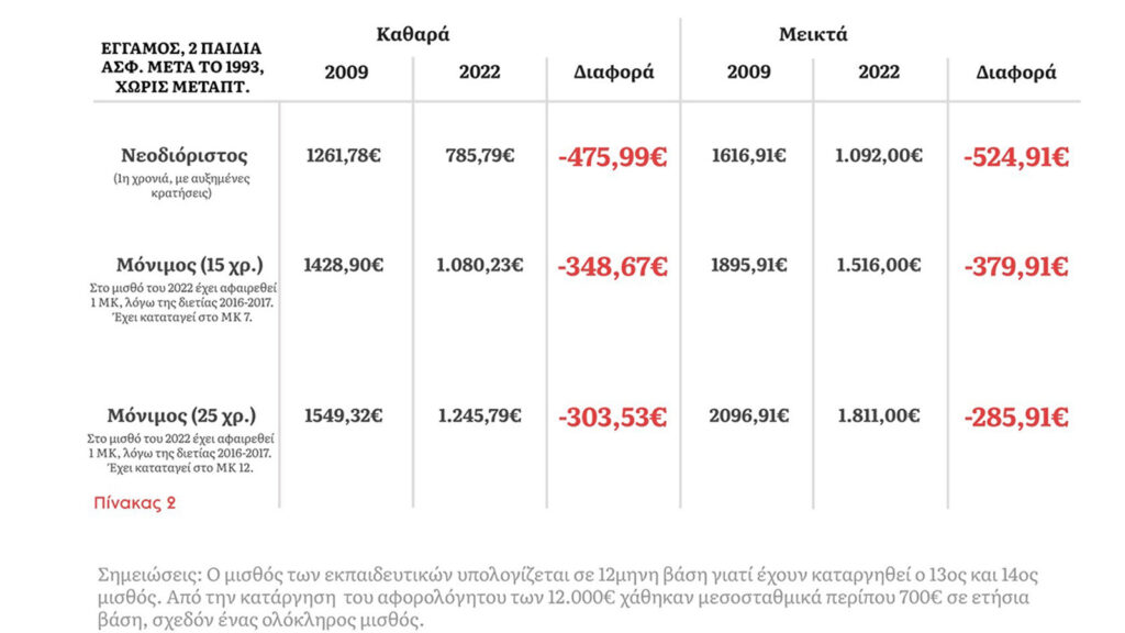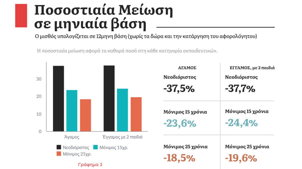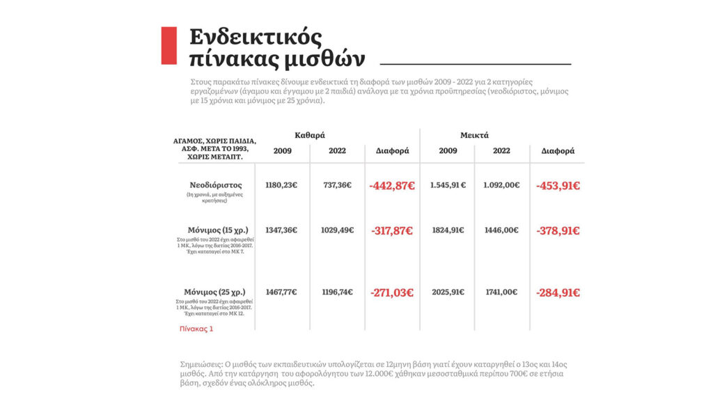 Λέμε ένα μεγάλο: Φτάνει πια! Δεν μπορούμε να ματώνουμε άλλο για να προσφέρουμε στο αντικείμενο που σπουδάσαμε και που τόσο πολύ αγαπάμε! Οι εκπαιδευτικοί για να μπορούμε να ανταποκριθούμε στον παιδαγωγικό μας ρόλο, πρέπει πρώτα και κύρια να μπορούμε να ζούμε σαν άνθρωποι! Να μη χρειάζεται να καταφεύγουμε σε 2η και 3η δουλειά, για να τα φέρουμε βόλτα. Γι’ αυτό απαιτούμε να ζούμε με αξιοπρέπεια από τον μισθό μας! 12 χρόνια τώρα “ματώσαμε” από τις περικοπές που μας επέβαλαν εναλλάξ και όλες μαζί οι κυβερνήσεις. Έχουμε χάσει πάνω από 6 (!) μισθούς, στις συνολικές ετήσιες απολαβές μας, τα τελευταία 12 χρόνια. Ενας νεοδιόριστος/η, χωρίς τέκνα, που δουλεύει για πρώτη φορά στην εκπαίδευση, αμείβεται με 737 ευρώ, όταν το 2009 λάμβανε 1.180 ευρώ».