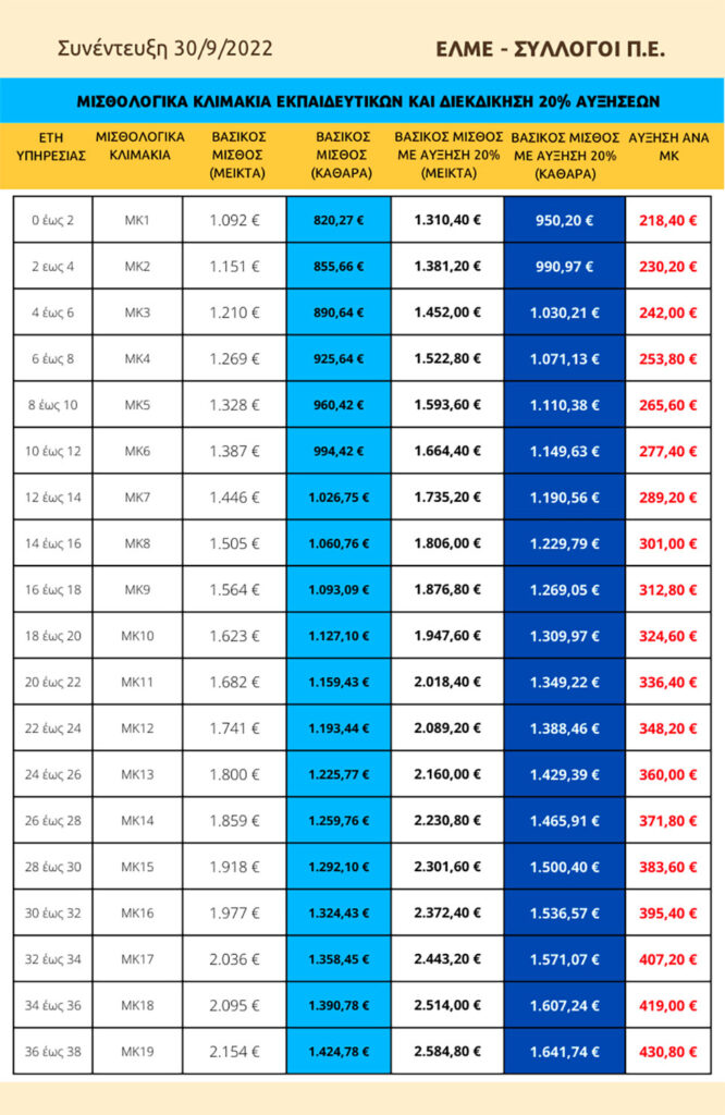 - Αύξηση μισθού κατά 20% στο εισαγωγικό κλιμάκιο (δηλ 950 ευρώ καθαρά) και αντίστοιχα σε όλα τα υπόλοιπα.