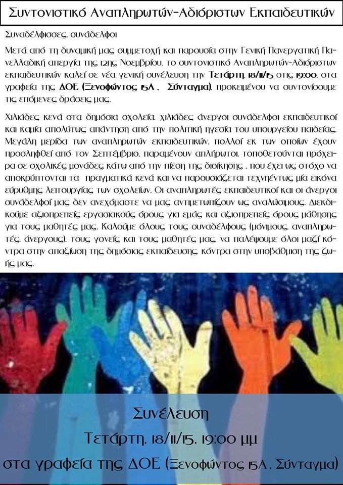 Συντονιστικό αναπληρωτών-Αδιόριστων Εκπαιδευτικών: συνέλευση 18/11, 7.00μ.μ. στα γραφεία της ΔΟΕ