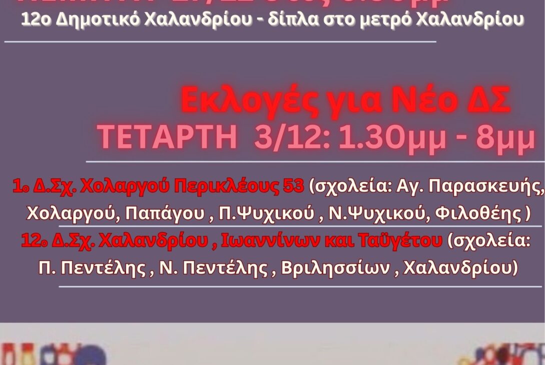 Το Δ.Σ. του Συλλόγου μας καλεί τα μέλη του στην Εκλογοαπολογιστική Γ.Σ την Πέμπτη 27 Νοεμβρίου στο 12ο Δ.Σχ. Χαλανδρίου στις 18:30 και εκλογές για την ανάδειξη νέου Δ.Σ την Τετάρτη 3 Δεκεμβρίου