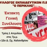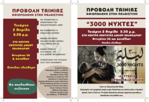 Ο Σύλλογος Εκπαιδευτικών Π.Ε. « Ο ΠΕΡΙΚΛΗΣ » συνδιοργανώνει με την Επιτροπή Ειρήνης Χαλανδρίου και με άλλους φορείς την προβολή της Παλαιστινιακής ταινίας “3000 Νύχτες” στο Κέντρο Νεότητα Δήμου Χαλανδρίου, Αντιγόνης 56 & Δαναΐδων την Τετάρτη 2 Απριλίου στις 5.30 μ.μ. με σκοπό τη συμπαράσταση στον αγώνα που δίνει ο Παλαιστινιακός λαός για λευτεριά και ανεξαρτησία .
