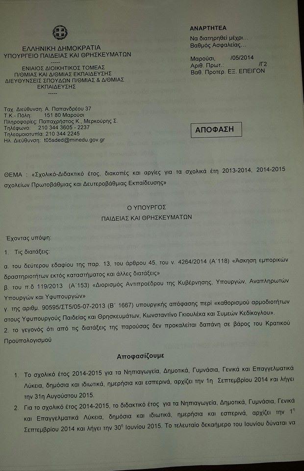Η απόφαση του Υπουργείου Παιδείας που έχει πάει για δημοσίευση στην Εφημερίδα της Κυβέρνησης όπως βλέπετε περιλαμβάνει τα παρακάτω, ανάμεσα σε άλλα: