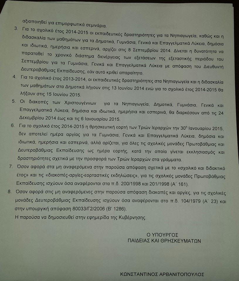 Για το σχολικό έτος 2014-15 η θρησκευτική εορτή των Τριών Ιεραρχών την 30η Ιανουαρίου 2015, δεν αποτελεί ημέρα αργίας , για όλες τις σχολικές μονάδες Πρωτοβάθμιας και Δευτεροβάθμιας εκπαίδευσης ορίζεται ως ημέρα εορτής, κατά την οποία γίνεται εκκλησιασμός και δραστηριότητες σχετικά με την προσφορά των Τριών Ιεραρχών στα γράμματα.