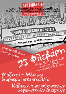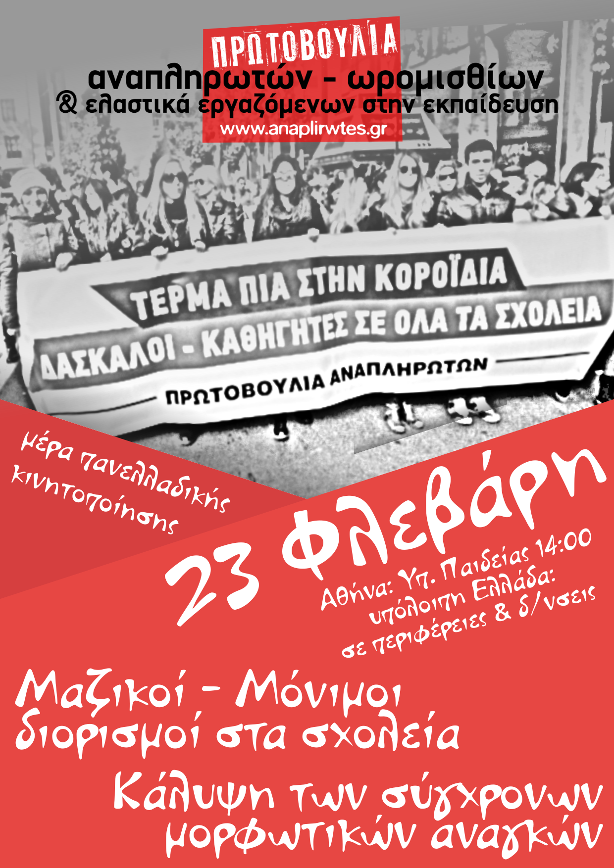 - Συμμετοχή στην Ημέρα Πανελλαδική Δράσης στις 23 Φλεβάρη, στο Υπουργείο Παιδείας(2μ.μ.) με αίτημα: «Μαζικοί – Μόνιμοι Διορισμοί στα Σχολεία, Κάλυψη των Σύγχρονων Μορφωτικών Αναγκών».